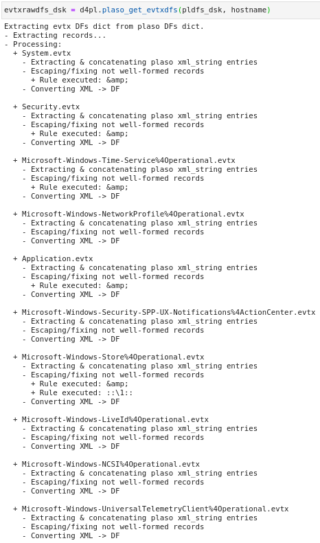 | plaso_get_evtxdfs() | plaso_get_evtxdfs(obj,options) | CLI | Creates dictionary of events from evtx files using Plaso Dataframe dictionary and the hostname. |
